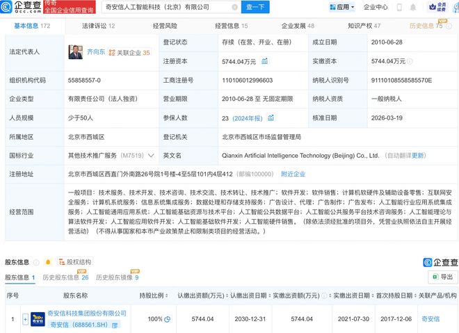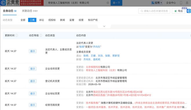 企查查APP显示多多国际APP,近日,原北京椒图科技有限公司发生工商变更,企业名称变更为奇安信人工智能科技(北京)有限公司,同时,多位高管发生变更。企查查信息显示,该公司成立于2010年,经营范围含互联网安全服务、人工智能行业应用系统集成服务、人工智能通用应用系统等,由奇安信-U(688561.SH)全资持股。