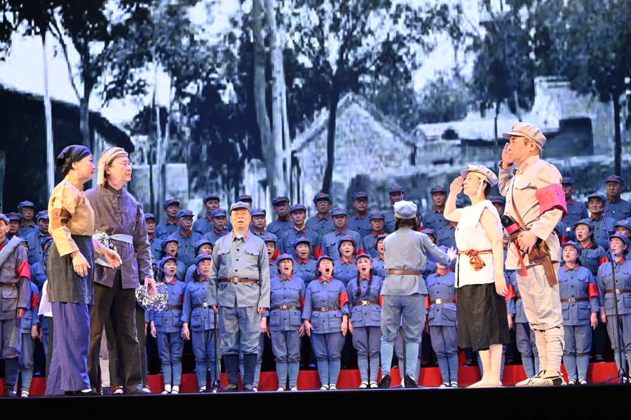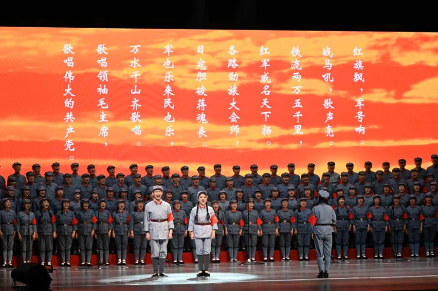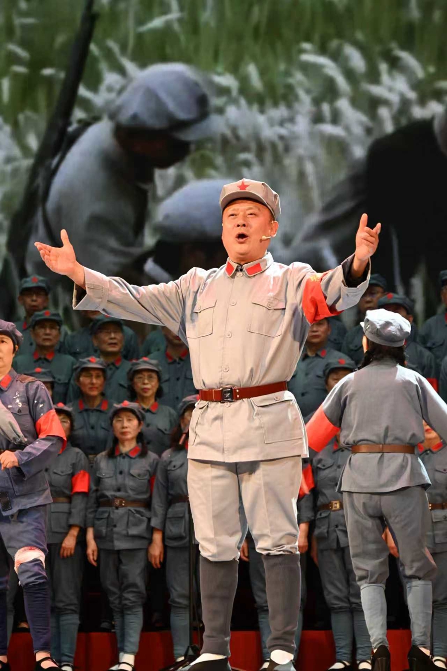 剧场内声浪一浪高过一浪:台上,200名合唱团成员及情景表演演员身着红军服,台下,300名合唱队员、60 名观众旗手配合演出,现场红旗招展,LED屏投射出与歌声相和的影像,专业领唱穿插其间,打破专业艺术与群众文艺的边界,营造融合的沉浸式舞台。