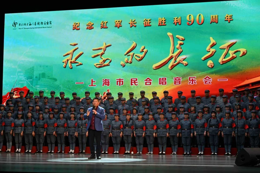 3月31日下午,激情昂扬的《长征组歌》在沪东工人文化宫剧场响起,纪念红军长征胜利90周年《永远的长征》上海市民合唱音乐会在此举行。作为第41届“上海之春”国际音乐节“新大众文艺”板块的群文活动,音乐会融合合唱、领唱、重唱、朗诵及情景演绎,以磅礴气势再现党的百年征程,讴歌“紧紧依靠人民群众、不怕牺牲、排除万难、争取胜利”的长征精神。