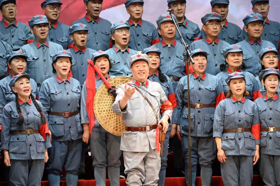 这是群众合唱的一次全新探索,专业演员和业余优秀团队携手合力赓续红色血脉。而做到情景表演、乐团与观众合唱方阵的有机融合,并非易事。为此,参演团队从站位、演唱细节到情景表演逐点打磨、反复练习。