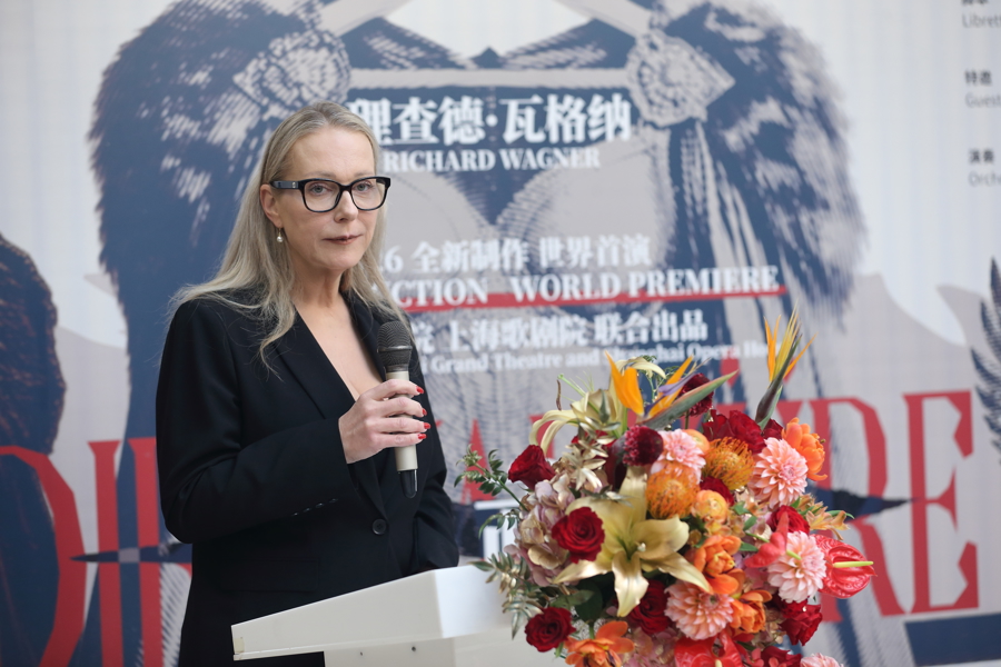 4月22日新闻发布会中,卡塔琳娜·瓦格纳感谢指挥家、上海歌剧院艺术总监、苏州交响乐团首席指挥许忠给予首演的巨大帮助。上海大剧院总经理张笑丁透露,全新《女武神》世界首演深受期待,26日演出已开出加座。
