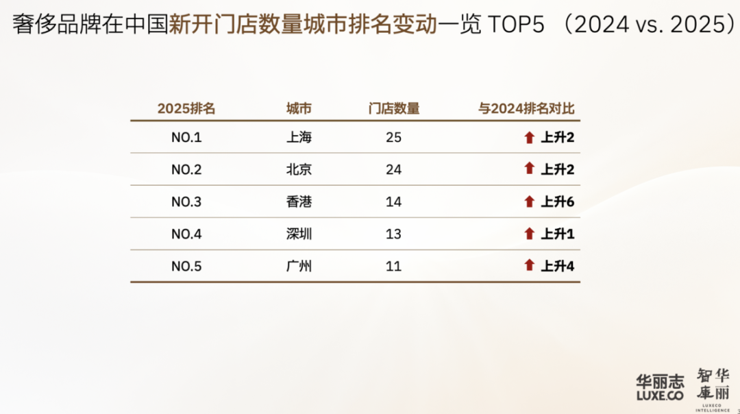 从数据看,「华丽智库」不久前发布的2025 年度“奢侈品牌中国活力榜”显示,香港是奢侈品牌新开门店数量TOP3的中国城市,排名较2024年大幅上升了6位。在高规格门店焕新的城市排行榜中,香港也高居第二。