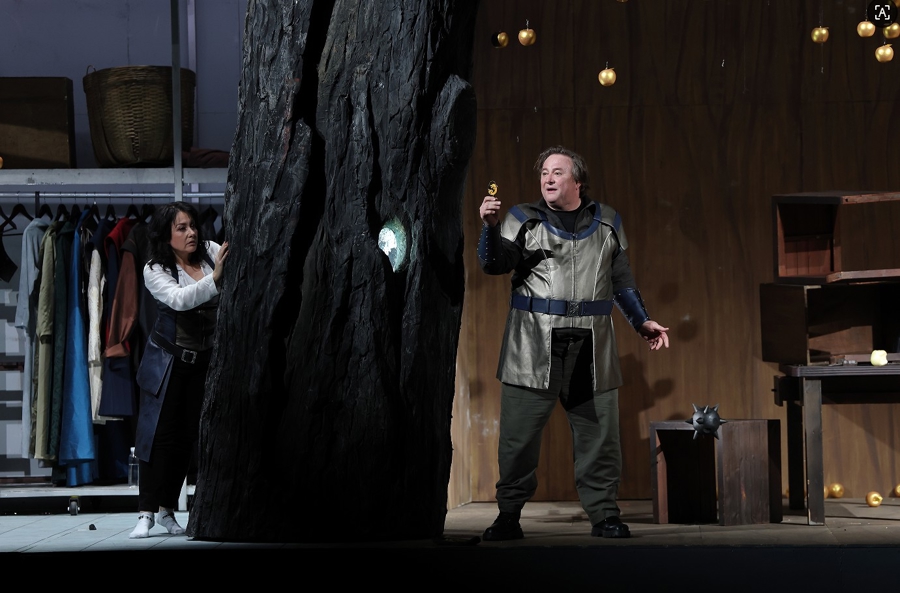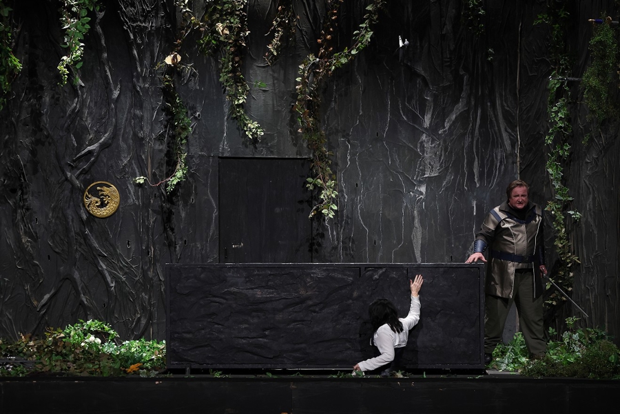 《女武神》序曲响起的刹那,一座庞大的游戏屋出现在舞台上,带着大写的招牌“指环的游戏”。大门打开又关上,玩家齐格蒙德走过昏暗的阶梯,从现实一步步踏入另一个平行的奇幻世界。卡塔琳娜·瓦格纳的导演思路是坚守瓦格纳音乐核心价值,她不颠覆乐剧的故事,但革新讲故事的框架,并因此延伸出崭新的舞台表达。伴随着熟悉的咏叹调,戏剧的主线成为“通关挑战”,这是一场别具野心的瓦格纳主题冒险。齐格蒙德和齐格林德身处在沉浸式的游戏空间,北欧神话里齐格蒙德不能脱离宿命地拔出“石中剑”,在游戏里成了玩家成功地突破第一间密室,两人携手继续“闯关”。